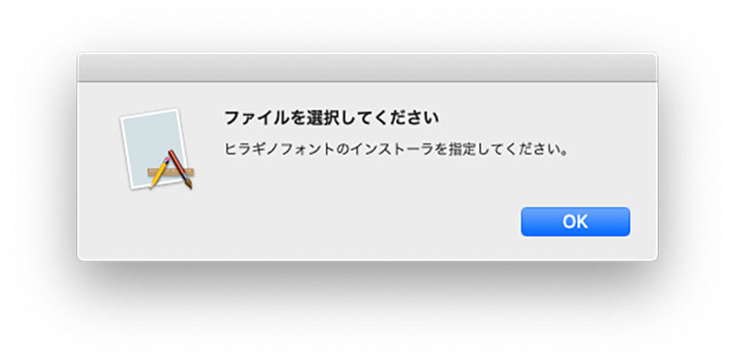 3.「FONTInstallTool_Mac2.0」のアイコンをダブルクリックすると「ファイルを選択してください」とメッセージが表示されますので「OK」をクリックしてください。