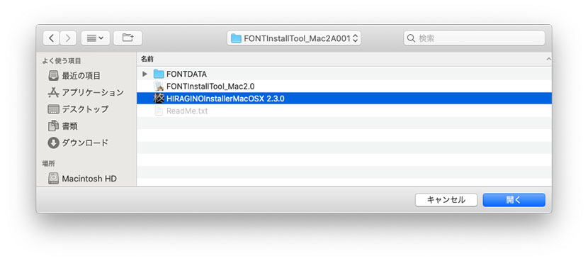 4.「FONTInstallTool_Mac2A001」フォルダ内のインストーラー「HIRAGINOInstallerMacOSX 2.3.0」を選択し「開く」をクリックしてください。