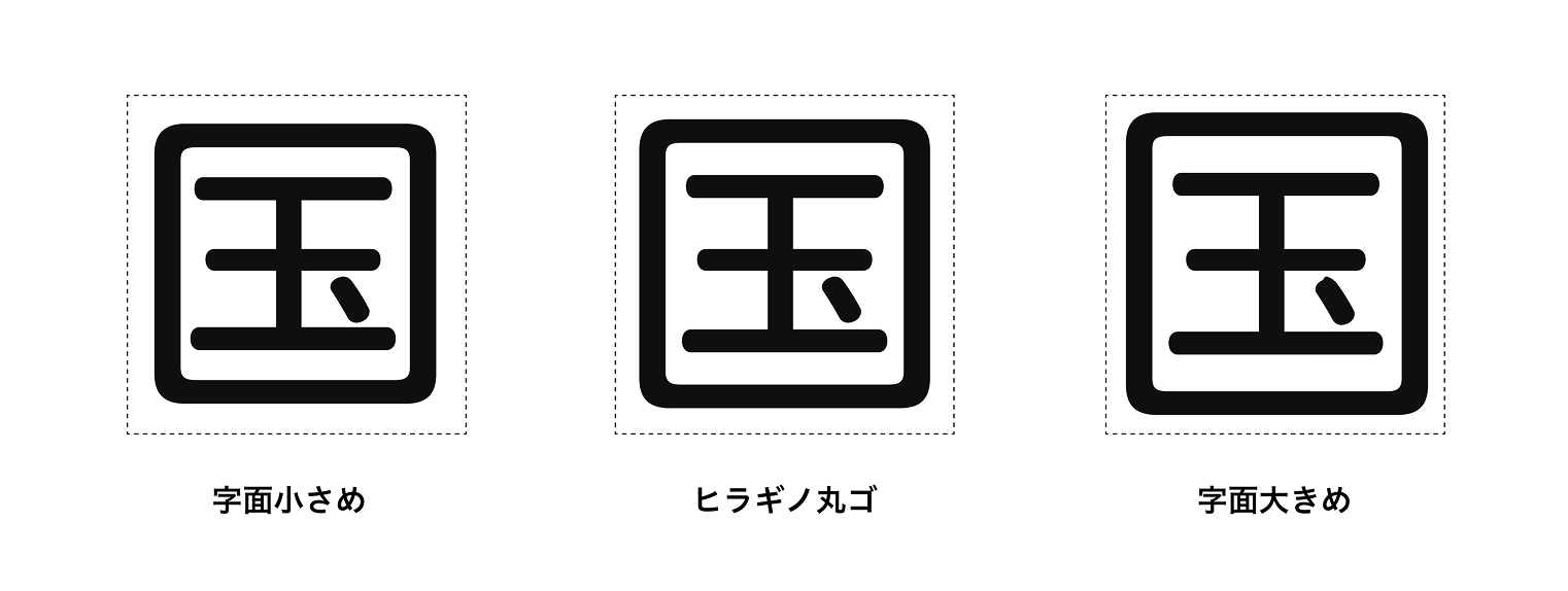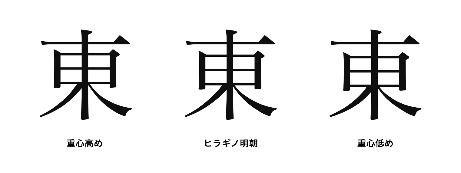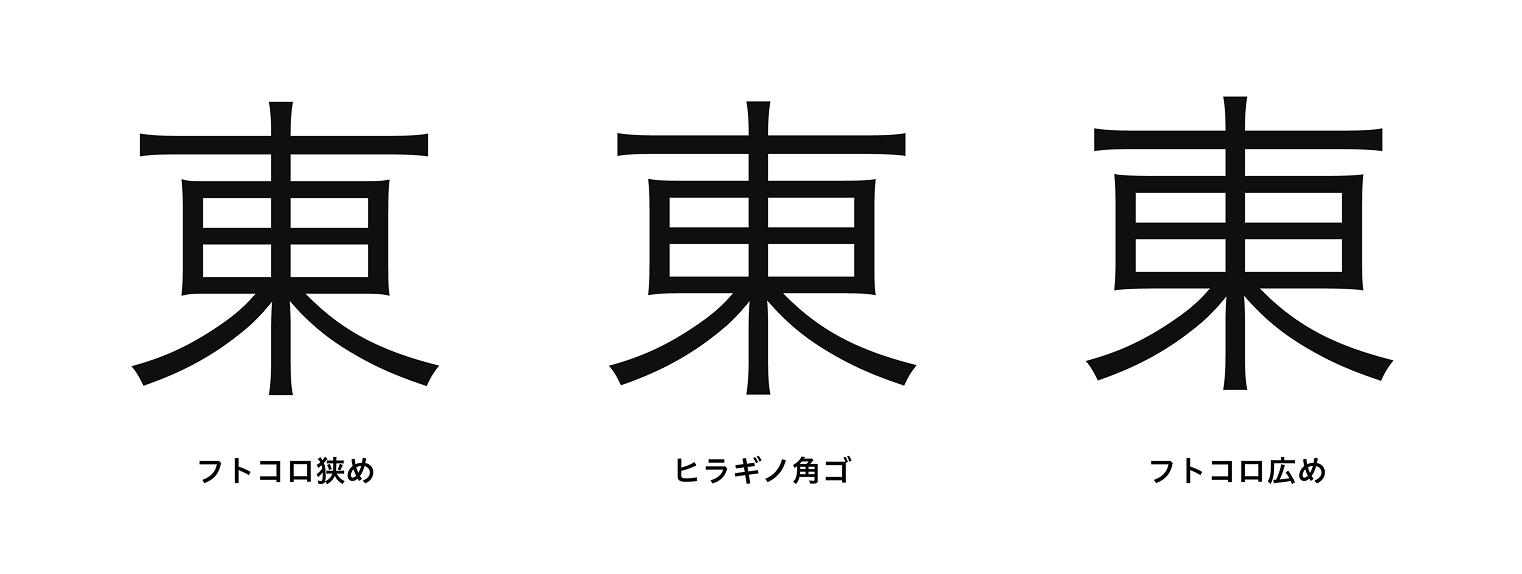 フトコロが狭いとスマートな印象、情緒的な印象になります。フトコロが広いと、明るく堂々とした印象になります。ヒラギノのフトコロはやや広めで、堂々としつつもスマートさを持ち合わせた、汎用性の高い設計です。