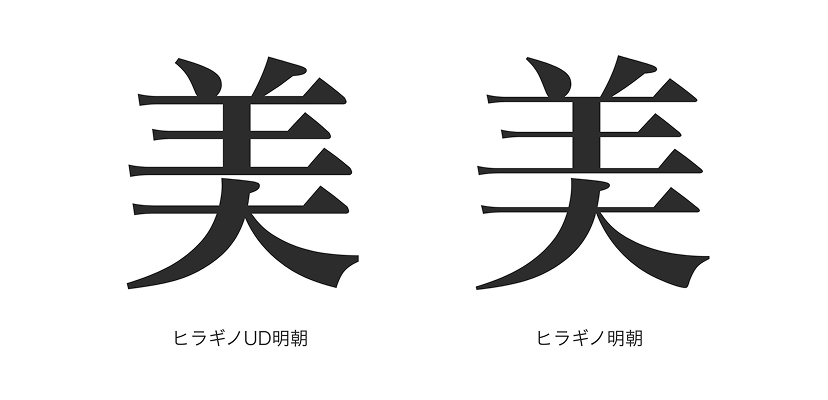 ヒラギノUD角ゴ・ヒラギノUD明朝・ヒラギノUD丸ゴは、中庸で「長く/楽に/読ませる」ことを重視しています。一方、ヒラギノUD角ゴFは、ヒラギノの現代的なデザインの印象を引き継ぎ、「くっきりと/見せる」ことを重視しています。
