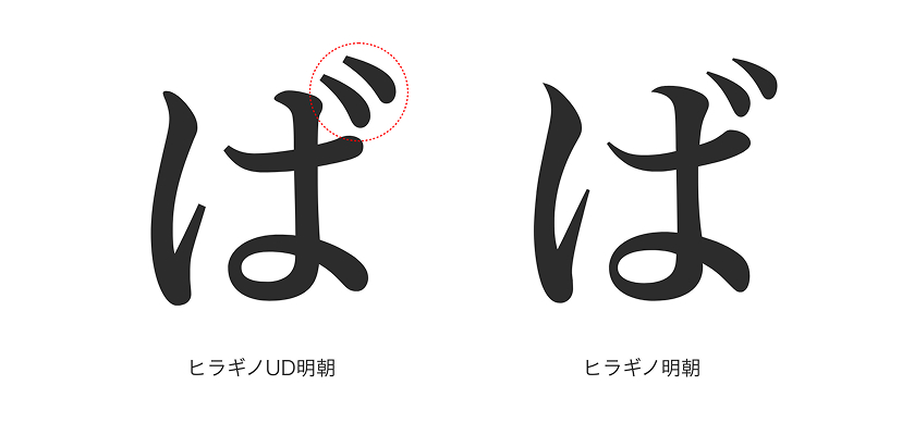 ヒラギノUDフォントの仮名は誤読につながりやすい濁点・半濁点を大きめに修正しています。濁点は点と点の位置を広げ、より明るく読みや取りやすくなっています。