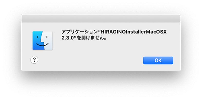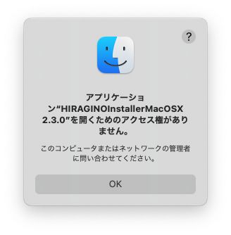 ※「"HIRAGINOInstallerMacOSX 2.3.0"から"ダウンロード"フォルダ内のファイルにアクセスしようとしています。」とメッセージが表示される場合は「OK」を選択してください。