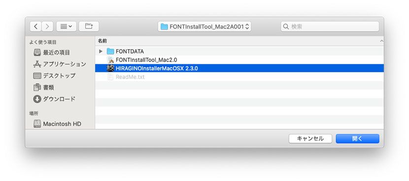 4.「FONTInstallTool_Mac2A001」フォルダ内のインストーラー「HIRAGINOInstallerMacOSX 2.3.0」を選択し「開く」をクリックしてください。